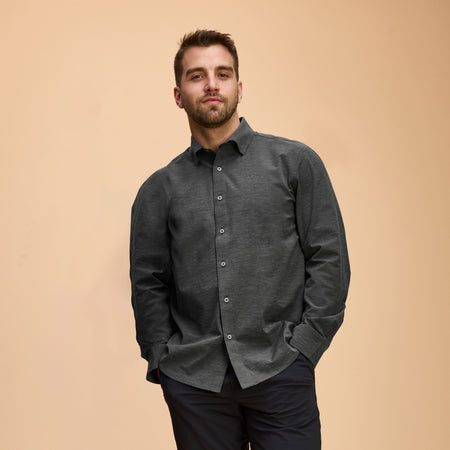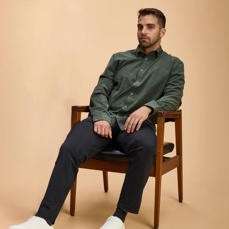 The average person spends 9.5 hours sitting. The least you can do is look great doing it. This performance-woven shirt—made from an organic cotton blend—provides all-day comfort and the kind of structure that says "raise, please".