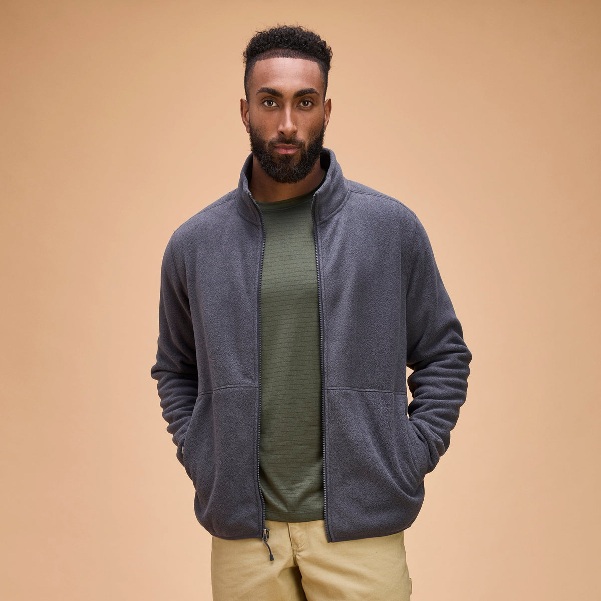 Super soft, high-quality bonded fleece Teddy fleece interior Teddy-lined hand pockets Coverstitch detail Made with 100% recycled materials and 40 GRS Certified post-consumer plastic bottles This style uses 1 zipper pull