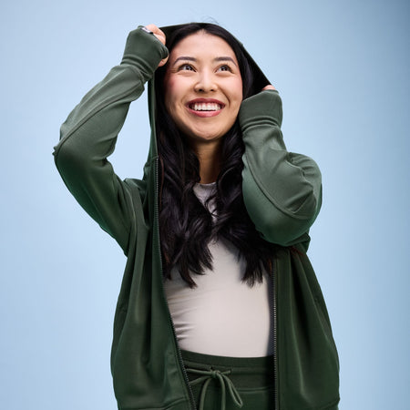 As soft as it looks—and then some. This hoodie is buttery on the outside, breathable on the inside, and built with thumbholes, because cold hands are a crime. It zips up clean, layers easy, and saves 13 plastic bottles from landfill while it’s at it. Cozy has never been this slick.