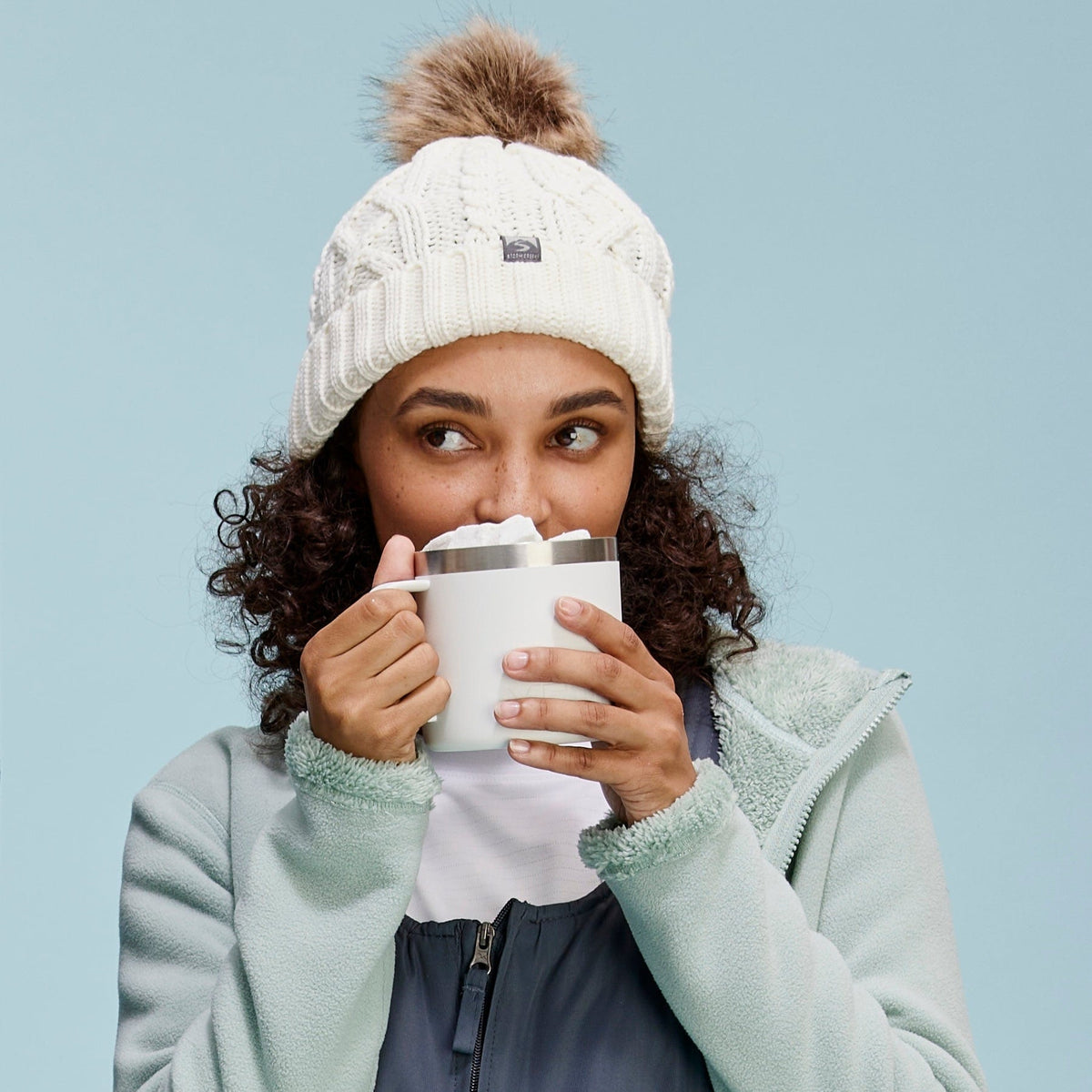 Bring on the cozy. This beanie features a faux fur pom, chunky cable knit, ribbed cuff, and is made out of 100% recycled materials. Plus, it’s the perfect amount of extra, as the name implies.